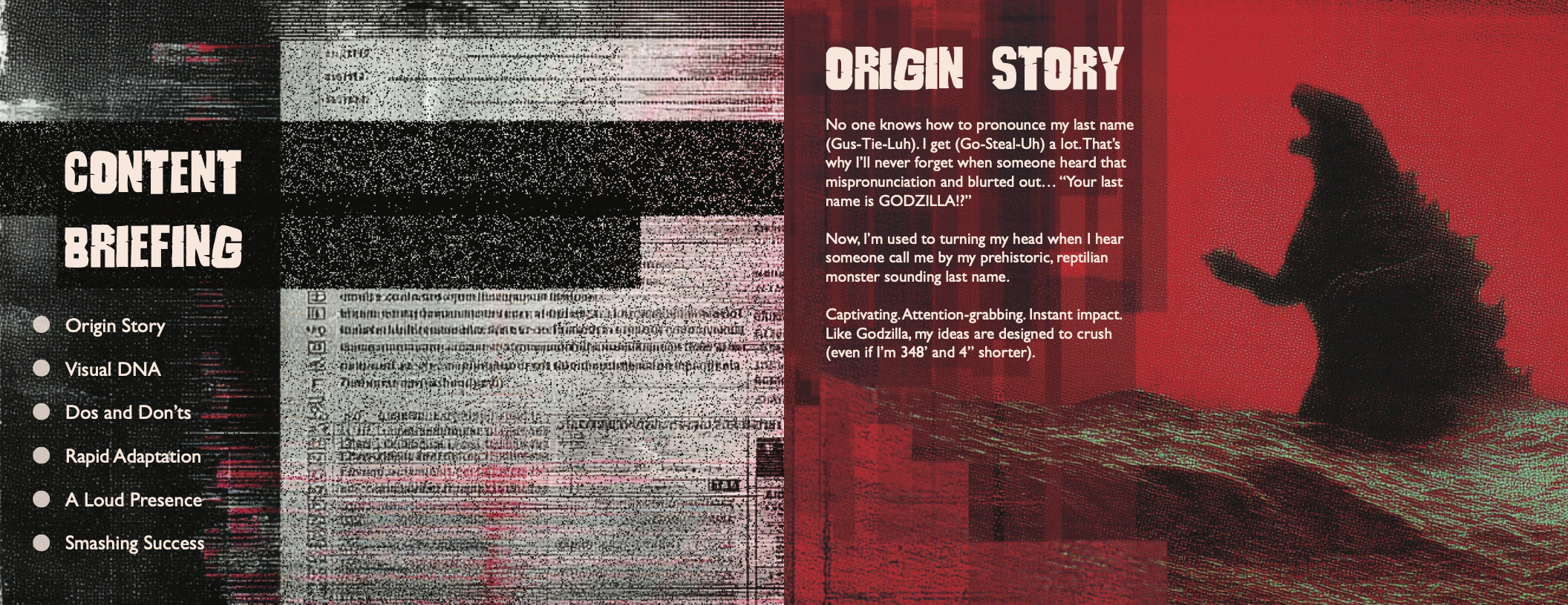Captivating. Attention-grabbing. Instant impact. Like Godzilla, my ideas are designed to crush (even if I'm 348' and 4" shorter).