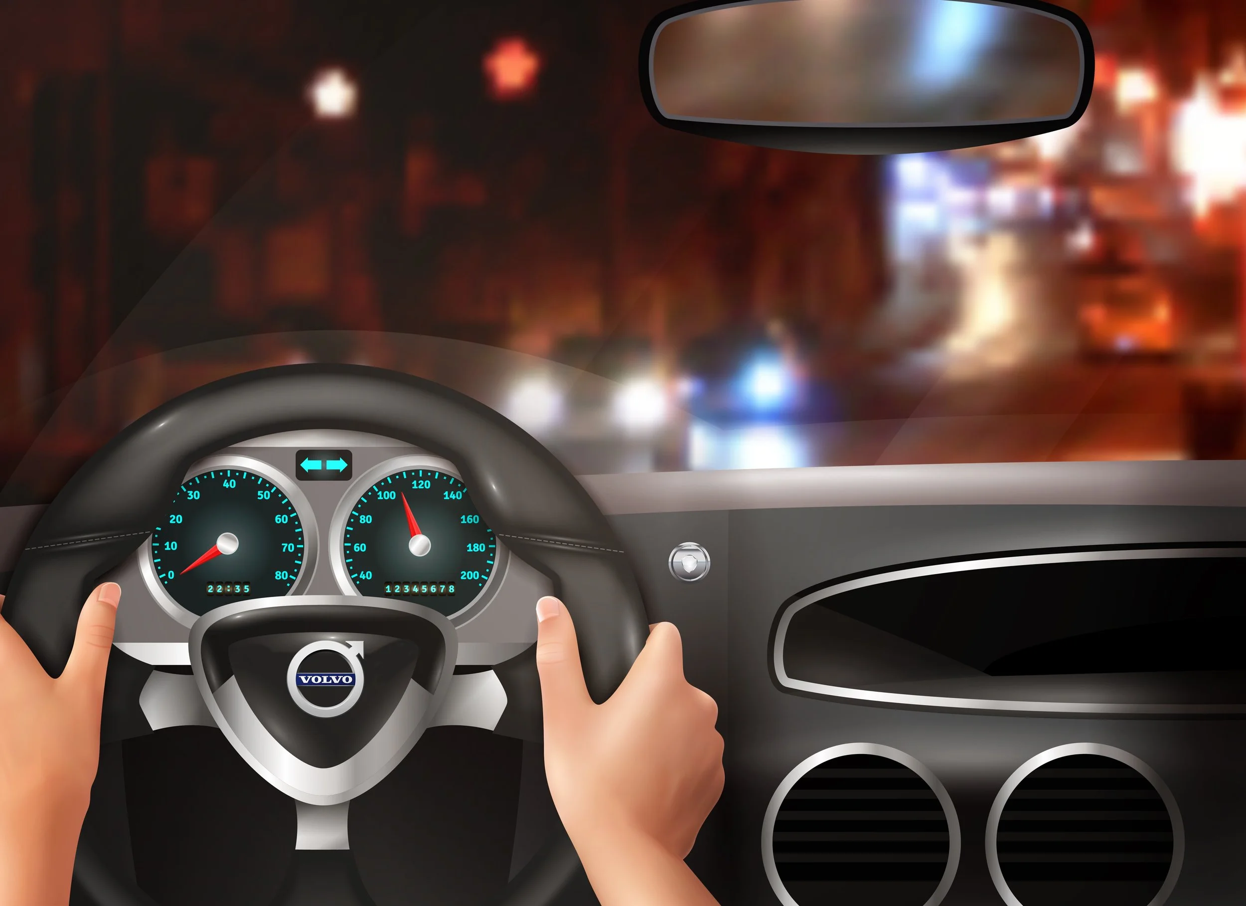 The blue light on the back dash mirror shows intent to pull over. The navigation system brings you to a well-lit area. Cameras on the side and dash mirrors start recording. Automated texts are sent to your emergency contacts.